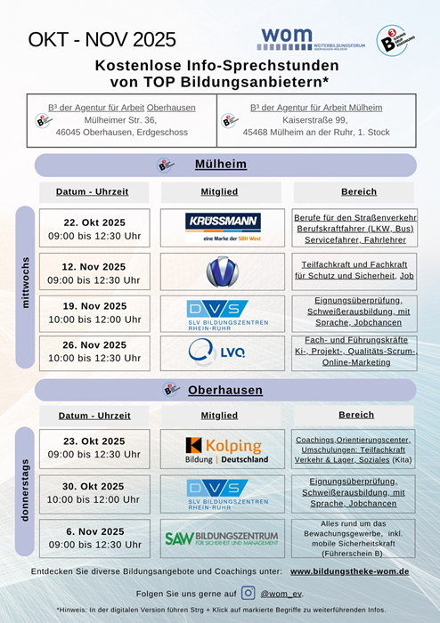 Im Rahmen der Zusammenarbeit mit dem B³ Beratungszentrum Oberhausen haben Mitglieder des Weiterbildungsforums Oberhausen-Mülheim e. V. die Möglichkeit, donnerstags nach individueller Terminabsprache eine Informations-Sprechstunde im B³ anzubieten. Der Raum des B³ wird zur Verfügung gestellt, um Arbeitssuchende oder interessierte Bürgerinnen und Bürger Information zu Qualifizierungs- und Weiterbildungsangeboten zu erteilen – direkt im Herzen von Oberhausen. Die Teilnahme ist für Interessierte kostenfrei und ohne Verpflichtung.